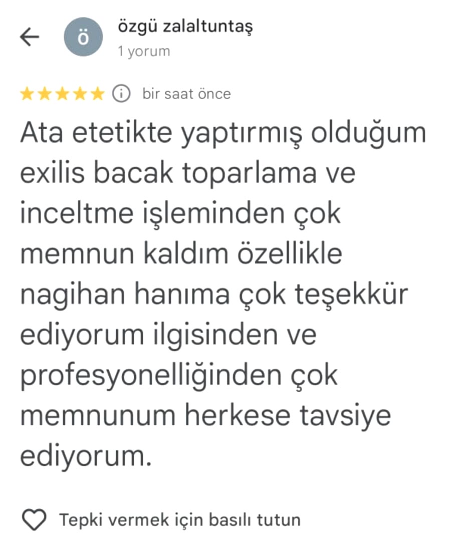 Ata etetikte yaptırmış olduğum exilis bacak toparlama ve inceltme işleminden çok memnun kaldım özellikle nagihan hanıma çok teşekkür ediyorum ilgisinden ve profesyonelliğinden çok memnunum herkese tavsiye ediyorum.