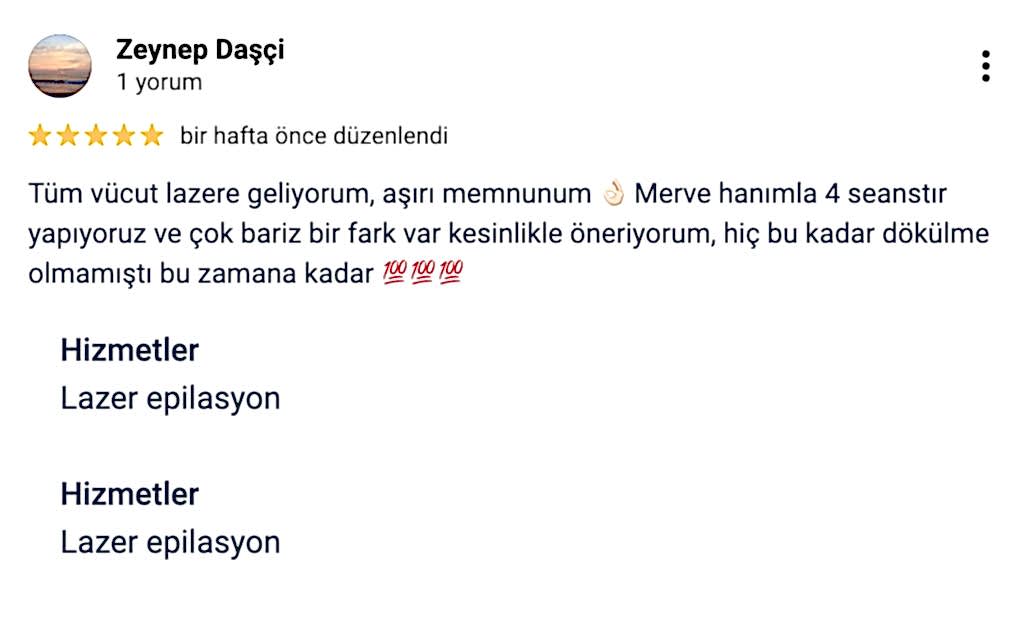 Tüm vücut lazere geliyorum, aşırı memnunum. Merve hanımla 4 seanstır yapıyoruz ve çok bariz bir fark var kesinlikle öneriyorum, hiç bu kadar dökülme olmamıştı bu zamana kadar.